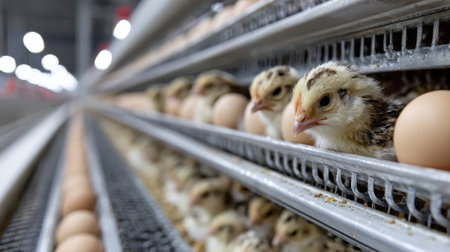 Rows of chicks and eggs sit on metallic shelves in a spacious indoor poultry farm setting. The scene is brightly lit, highlighting the young birds and freshly laid eggs