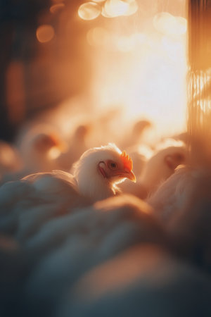 A group of chickens is seen in a barn, softly illuminated by warm light. The chickens appear calm and are nestled together in their cozy surroundings, enjoying the evening atmosphere.