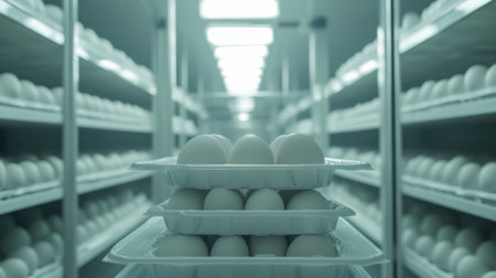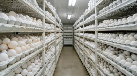 This image captures a modern food processing facility with neatly organized shelves filled with white eggs. The clean and efficient storage environment emphasizes hygiene and quality in food production.