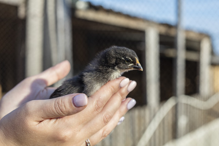 The baby yellow chicken in the hand with agriculture business farming background and yellow light.