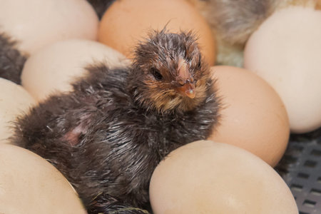 Close-up dark chicken chick small cute in chicken incubator eggs.