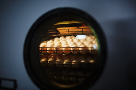 A warm glow bathes the rows of eggs resting in incubators, signaling the life within as the anticipation of hatching fills the air on a bustling farm.