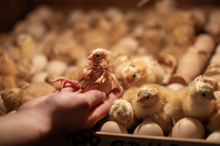 Newborn chick just hatched still in egg shell on farmer's palm in incubator