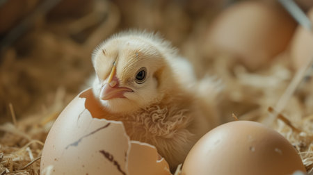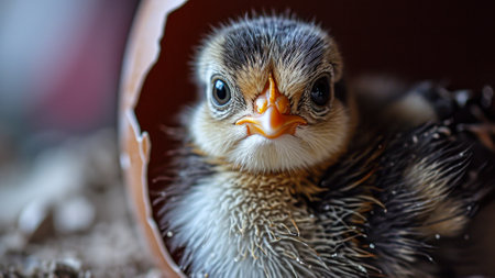 A close-up of an inquisitive chick peeking out from a cracked eggshell, symbolizing new life and beginnings.