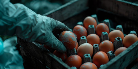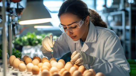Laboratory setting with a scientist inspecting chicken eggs for food safety and biotechnology research, promoting sustainable agricultural practices