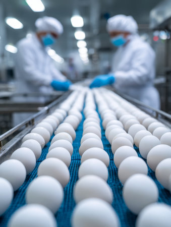 Skilled operators in clean, high-tech attire work meticulously on automated egg sorting lines, ensuring quality and safety in a contemporary production environment.