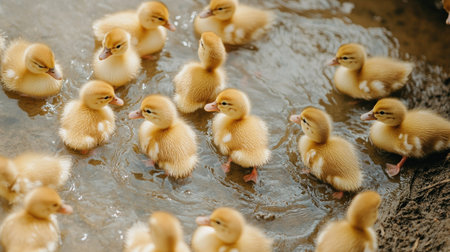 Top view of a farm's ducklings paddling in a shallow pool, with their fluffy feathers and tiny beaks visible.