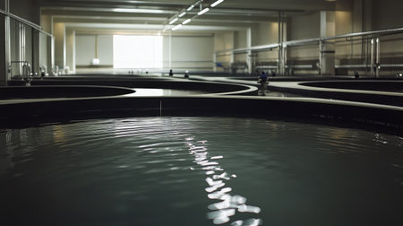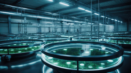 A glimpse into the cutting-edge futuristic aquaculture facility interior with circular tanks and innovative purple lighting technology for sustainable fish farming