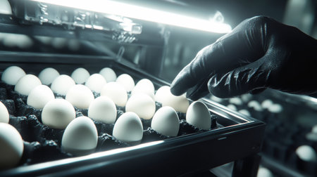 Gloved hands operate an egg portioning machine, carefully calibrating chicken eggs in a factory illuminated by bright sunlight, highlighting intricate details.