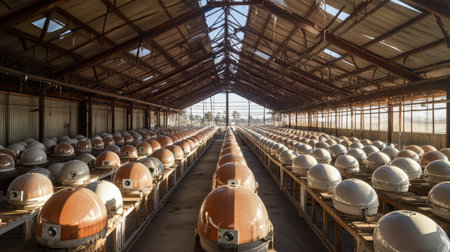An interior view of a spacious industrial warehouse filled with dome structures, showcasing organized arrangement and natural light through the ceiling.