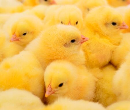 Many of little adorable yellow and black chickens sleep and look curious at farm, chicks birds background