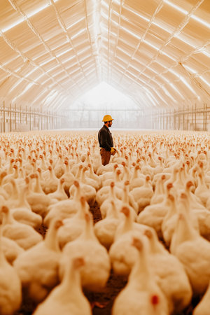 In a large, airy barn, a worker carefully observes a flock of turkeys moving about freely, surrounded by serene natural light illuminating the space and the birds white feathers.