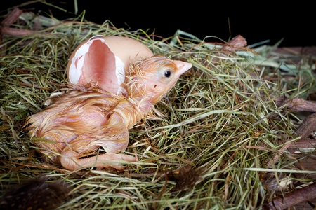 The Leghorn chick newborn was hatched from an egg in the nest.