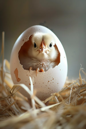 A baby chicken is peeking out of an eggshell. Concept of curiosity and wonder as the baby chicken explores its surroundings