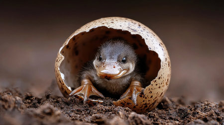 Newly hatched bird emerges from its eggshell, surrounded by soft, blurred background of warm colors and sparkling bokeh. scene captures essence of new beginnings and beauty of nature