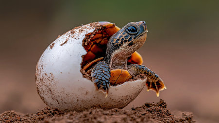 A baby turtle is laying in an eggshell. The shell is cracked open, and the turtle is peeking out. The scene is peaceful and serene, with the baby turtle looking curious and vulnerable
