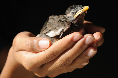 Bird breed in human hands being protected by a human after losing her mother in the wild