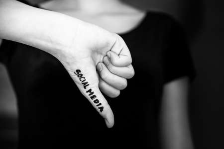 Black and white close-up of woman's hand making thumbs down gesture with words social media written on hand