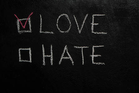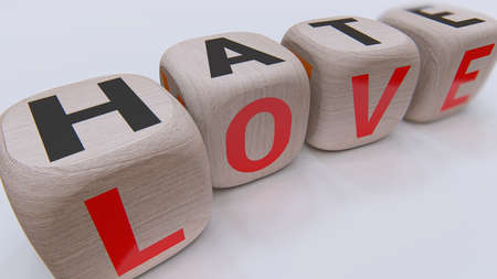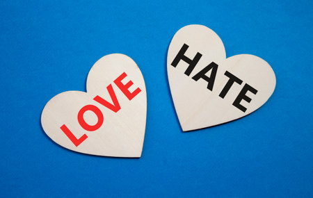 Love vs Hate symbol. Concept word Love vs Hate on wooden hearts. Beautiful blue background. Business and Love vs Hate concept. Copy space