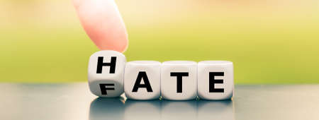 Wooden cubes with lettering spelling Care Hate. Concept that Care beats Hate