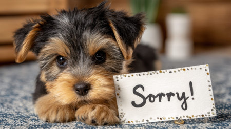 Adorable puppy holding sorry sign on carpet.