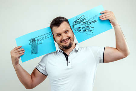 The man smiles and holds in his hands a blue sheet with a painted pistol on one side and a look of blood on the other