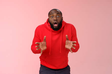 Shocked concerned young man worried employee drop fragule thing standing stupor intense stooping bending widen eyes troubled gesturing asking be careful, nervous pink background