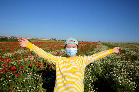 Portrait of a little boy wearing a medical mask and traveling in the garden. Protect from the coronavirus infection on home quarantine.