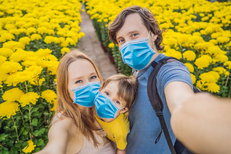 Caucasian tourists happy couple and child wearing a medical mask during pandemic in Tet holidays. Vietnam in springtime