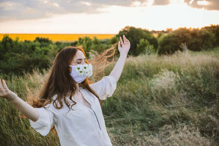 Wearing masks outdoors, Face Mask Reduce Allergy Symptoms. Outdoor portrait of woman in protective face Statement Masks with flowers on nature background