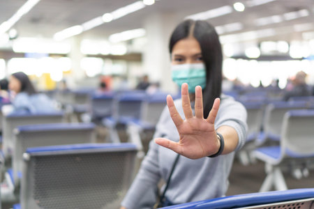 Asian woman wearing a surgical mask to protect against coronavirus, Lady sitting at Bangkok International Airport and show stop hands gesture.
