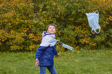 Young boy in park in autumn amid yellow leaf tossing medical disposable masks