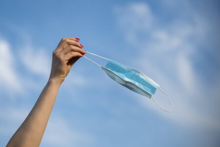 front view of single male hand clenched carrying corona virus protection mask by the elastic, set against dramatic dark background and lighting