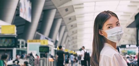 Airport Asian woman tourist boarding plane taking a flight wearing face mask. Coronavirus flu virus travel concept banner panorama.
