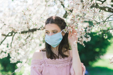 A young female in a medical face mask to avoid the spread coronavirus in the park between flowering trees.