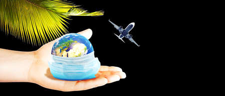 Traveling during the coronavirus pandemic. Protective masks and airplane model on gray background. Safe travel concept.