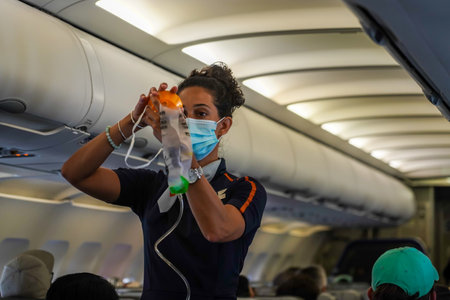 QUEENS, NEW YORK - AUGUST 7, 2021: Jet Blue flight attendant demonstrating the use of an oxygen mask during a pre-flight safety demonstration