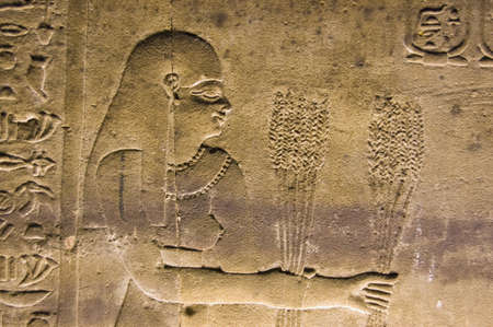 Ancient egyptian stone carving of a priestess presenting wheat crop harvest to the gods. Interior of the Temple of Horus at Edfu, Egypt.