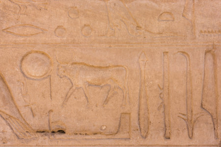 Ancient hieroglyphs and relief engravings carved into a stone wall at Luxor Temple of Amun-Ra
