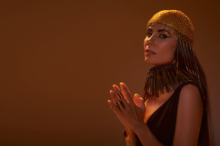 Woman in golden headdress and egyptian look looking at camera isolated on brown with light