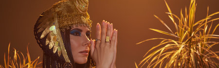Woman in egyptian attire doing praying hands gesture near desert plants isolated on brown, banner