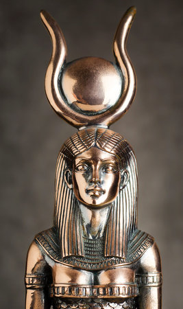 The Egyptian goddess ISIS on a black background. A bronze Egyptian goddess with a circle on her head.