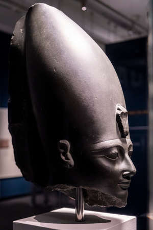 Turin, Italy, March 8 2013: pharaon statue face at the Egyptian Museum