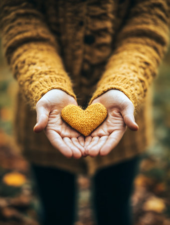Hands presenting a knitted heart in an outdoor autumn setting, symbolizing warmth and love.
