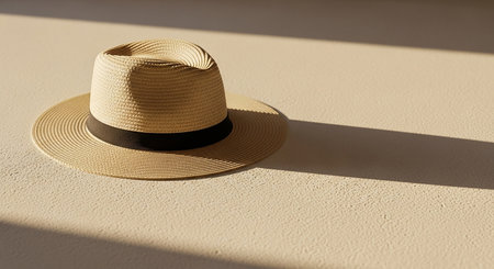 A straw fedora hat with a black ribbon sits on a textured beige surface with a long shadow.