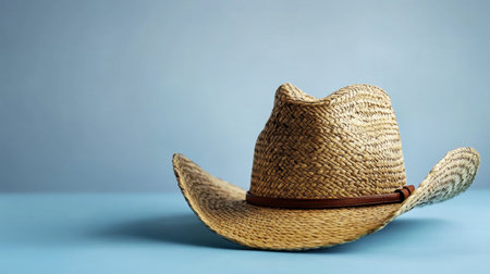 This charming straw cowboy hat rests elegantly against a soft blue background, symbolizing summer style and outdoor adventures with a rustic charm.