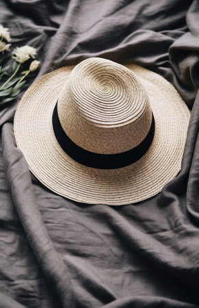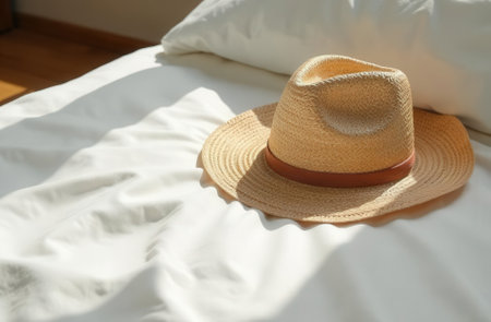 A beautiful straw hat lies gracefully on a white surface, casting soft shadows. This image captures the essence of summer fashion and leisurely days outdoors.