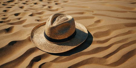 A wide-brimmed straw hat rests on a textured surface, illuminated by natural sunlight.