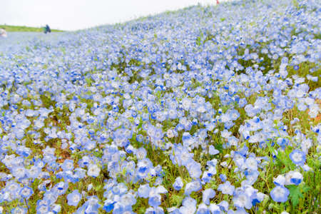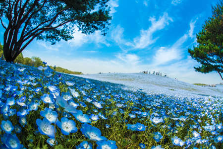Blue sky and Nemophila menziesii (baby blue eyes flower), flower field at Hitachi Seaside park, Spring, Ibaraki, Japan