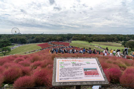 Crowded people going to the Miharashi Hill to see the red kochia bushes in the Hitachi Seaside Park. Kochia Carnival. Ibaraki Prefecture, Japan.